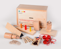 • 4 dmuchajki w kolorze naturalnym, czerwonym, zielonym i niebieskim, wykonane z drewna bukowego o średnicy 6 cm i wysokości 5 cm, • 4 piłeczki styropianowe o średnicy 2,5 cm, • 4 słomki.