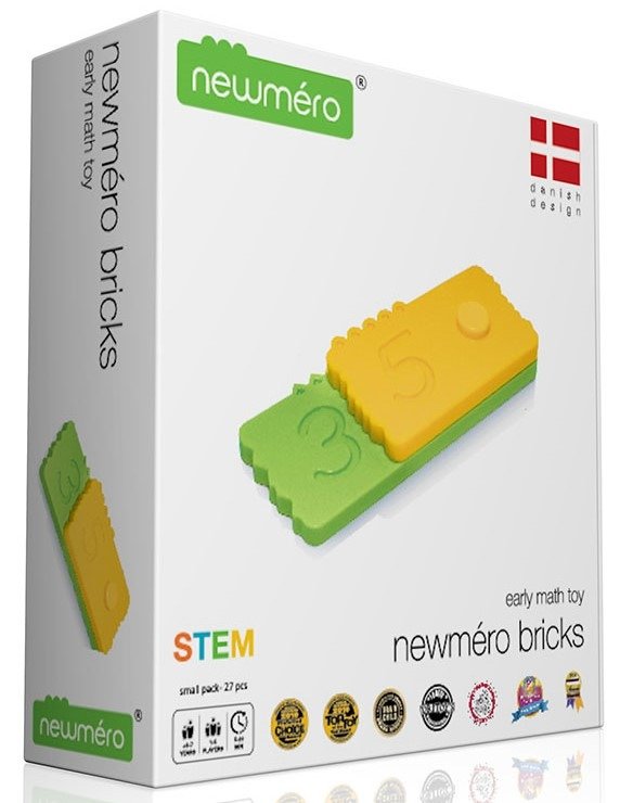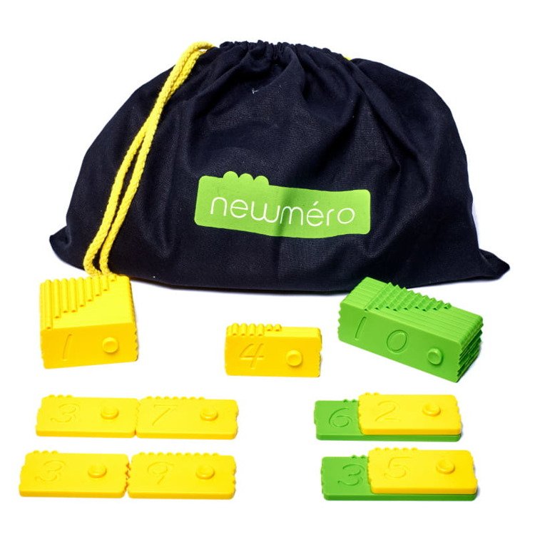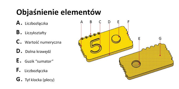 Newmero - zestaw dla przedszkolaka Z tym zestawem nauczysz dziecko rozpoznawania liczb od 1 do 99, porównywania wartości, dopełniania do 10, dodawania i odejmowania w zakresie od 1 do 99. W zestawie: - 2 zestawy jedności (wartości od 1 do 9) – klocki żółte - 1 zestaw dziesiątek (wartości od 10 do 90) – klocki zielone - bawełniany woreczek - instrukcję po polsku z przykładami gier i zabaw Czego nauczy się Twoje dziecko podczas zabawy newmero? - rozpoznawania liczb - prawidłowego czytania liczb (od lewej do prawej, odczytywanie pozycji, czyli na którym miejscu są jedności, dziesiątki, setki i tysiące) - kojarzenia zapisu z wartością (przełożenie abstrakt/konkret) - porównywania wartości liczb (więcej, mniej, równo) - dopełniania do 10 - dodawania - odejmowania - dodawania i odejmowania z przekraczaniem kolejnych progów 10, 100 i 1000. Cechy klocków newmero Zarówno kształt, rozmiar, waga i kolory jak i sam materiał i jego powierzchnia zostały dobrane tak, aby klocki sprostały badawczej naturze dzieci. Dzięki wnikliwym obserwacjom producenta, klocki same prowadzą dzieci do odpowiedzi i umożliwiają sprawdzenie czy wynik jest prawidłowy. Podstawowe elementy klocka A. Liczbozłączka – służy do tworzenia par dopełniających się do 10, 100 lub 1000. B. Liczykształty – pokazują wartość klocka C. Wyżłobiona liczba – zapis matematyczny D. Dolna krawędź klocka E. Guzik sumator – tworzy sumę, ułatwia budowanie liczb F. Liczbozłączka G. „plecy” klocka