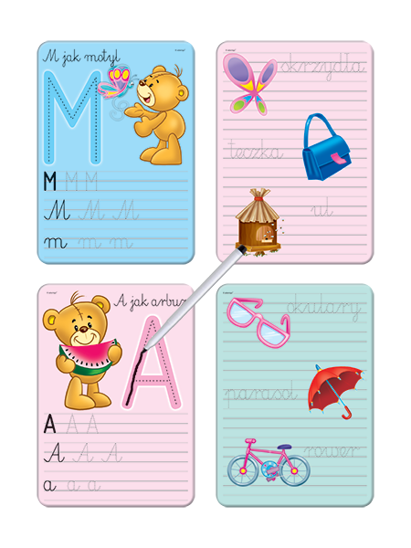 Zestaw kreatywny do nauki pisania cyferek i rozwiązywania zadań. Ćwiczenia ułatwia specjalny mazak, którym można pisać, zetrzeć go ściereczką i spróbować jeszcze raz. Zestaw zawiera: 6 dwustronnych tablic do nauki pisania cyferek o wymiarach: 11,5 x 16,3 cm, 10 dwustronnych tablic z zadaniami, suchościeralny marker, ściereczkę.