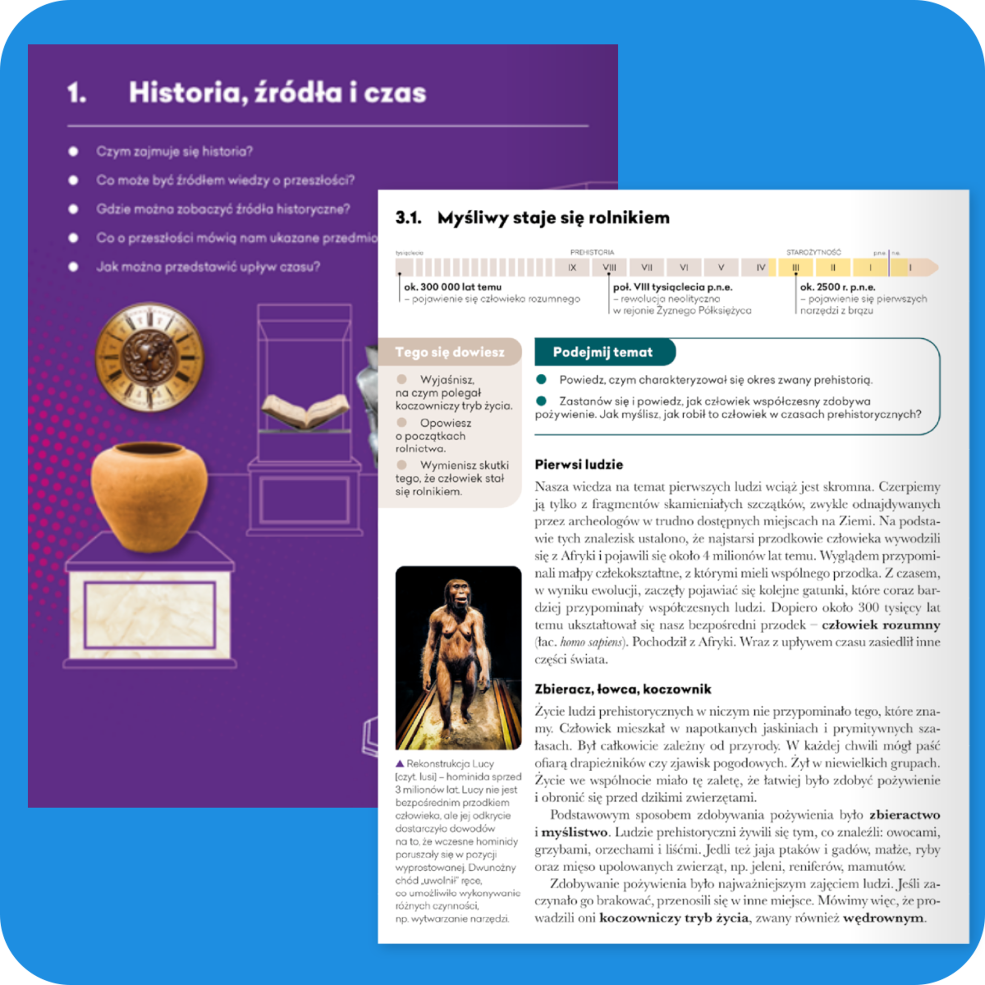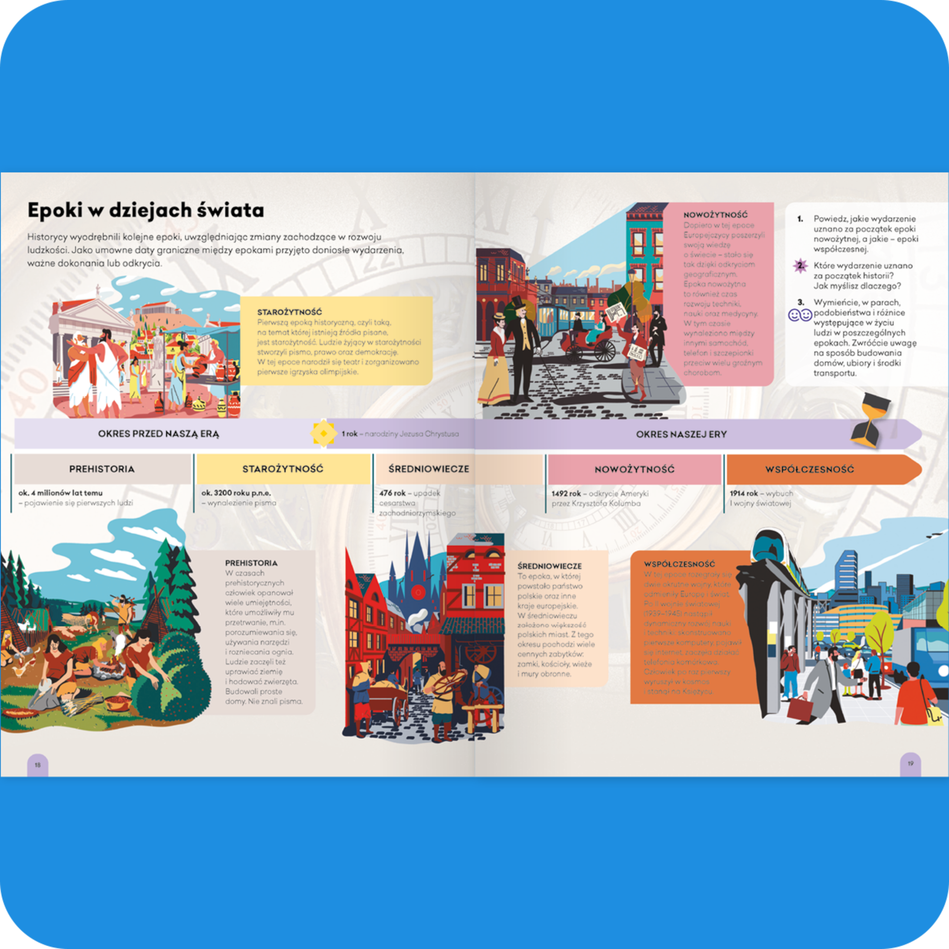 Oś czasu na początku każdego tematu z czytelnym podziałem na epoki – ułatwia umiejscowienie wydarzeń w czasie