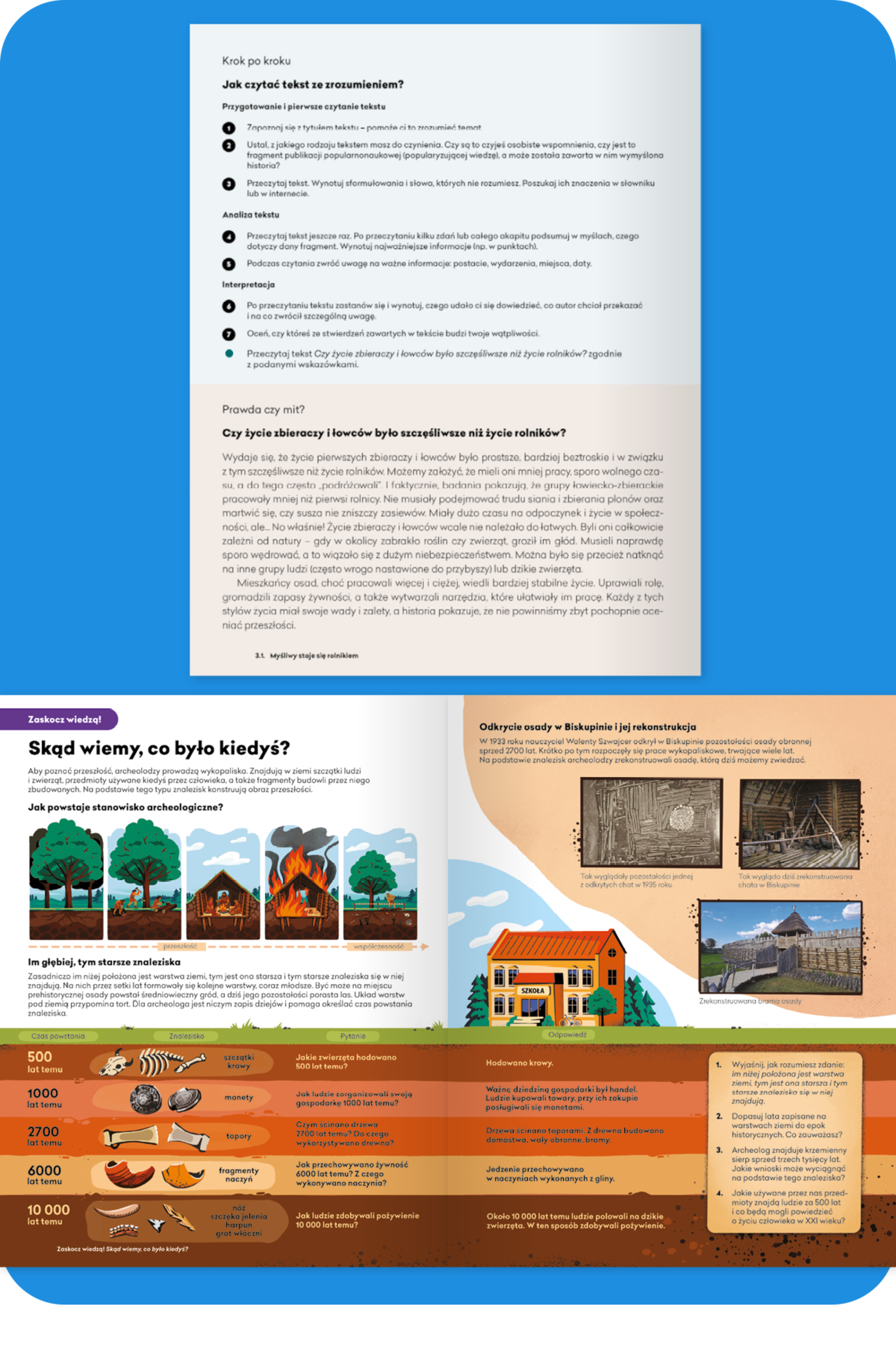 Różnorodne teksty źródłowe, teksty popularnonaukowe, mapy, źródła ikonograficzne, materiały statystyczne i współczesne teksty kultury, opatrzone poleceniami, rozwijają umiejętności analizy i interpretacji.