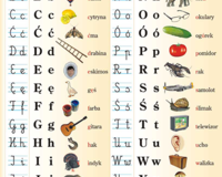 Plansza ścienna dwustronnie foliowana, z listwą metalową i zawieszką. Zawiera wszystkie litery alfabetu polskiego oraz przykładowe słowa wraz z ilustracjami.