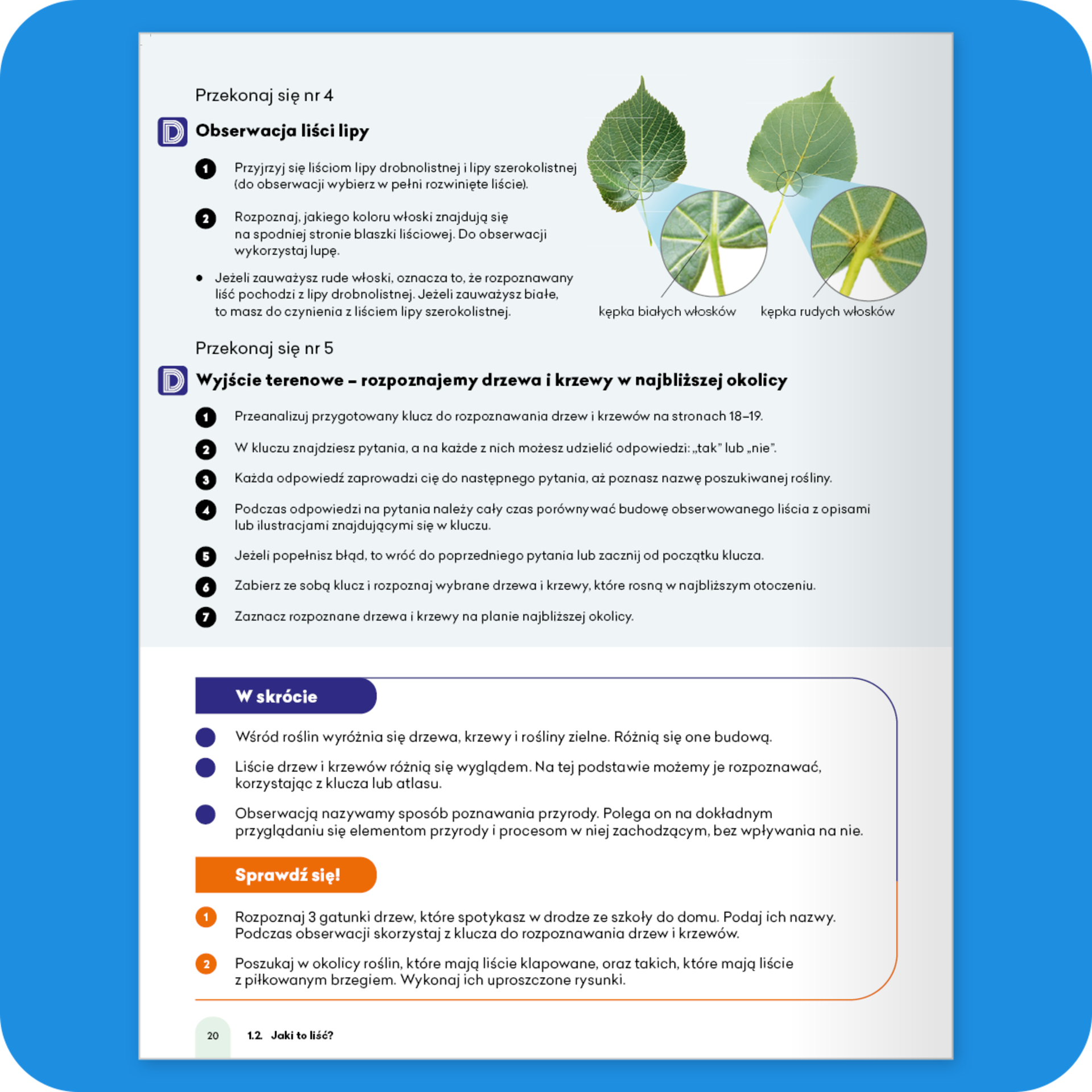 Propozycje zajęć terenowych, zawarte w module Przekonaj się, zostały opracowane tak, aby nauczyciel mógł je łatwo zaplanować i przeprowadzić. Zachęcają do poznawania i odkrywania najbliższej okolicy. Z naszym podręcznikiem wyjście w teren jest bezstresowe zgodnie z zasadą, że „teren to wszystko, co uczeń odkryje już za drzwiami szkoły”.